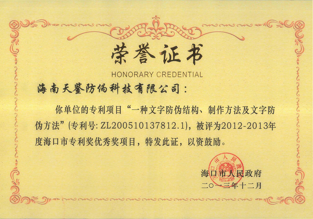 海南天鑒擁有國家唯一的“三維碼工程技術研究院”—海南省天鑒三維碼工程技術研究院。擁有以“結構三維碼”技術為支撐的200多項專利群,每年新申請專利成倍遞增。多次承擔國家科技部中小企業技術創新項目、國家火炬計劃項目以及海南省重大科技項目、海南省重點科技項目等,項目多次被認定為海南省高新技術項目,獲得“海南省科技進步二等獎”、“海口市科技進步一等獎”、“海口市專利優秀獎”等殊榮,企業被認定為“國家級高新技術企業”、“中國防偽行業優秀企業”、“海南省創新型企業”等。公司與北京印刷學院等多所知名院校建立了長期的產學研戰略合作關系。