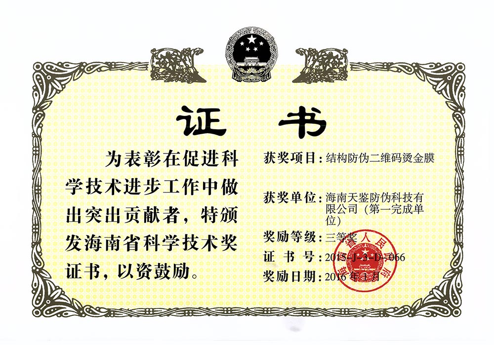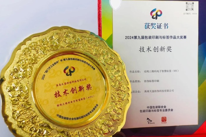 喜訊!海南天鑒防偽科技有限公司榮獲第九屆包裝印刷與標簽作品大獎賽技術創新獎!2024-12-20